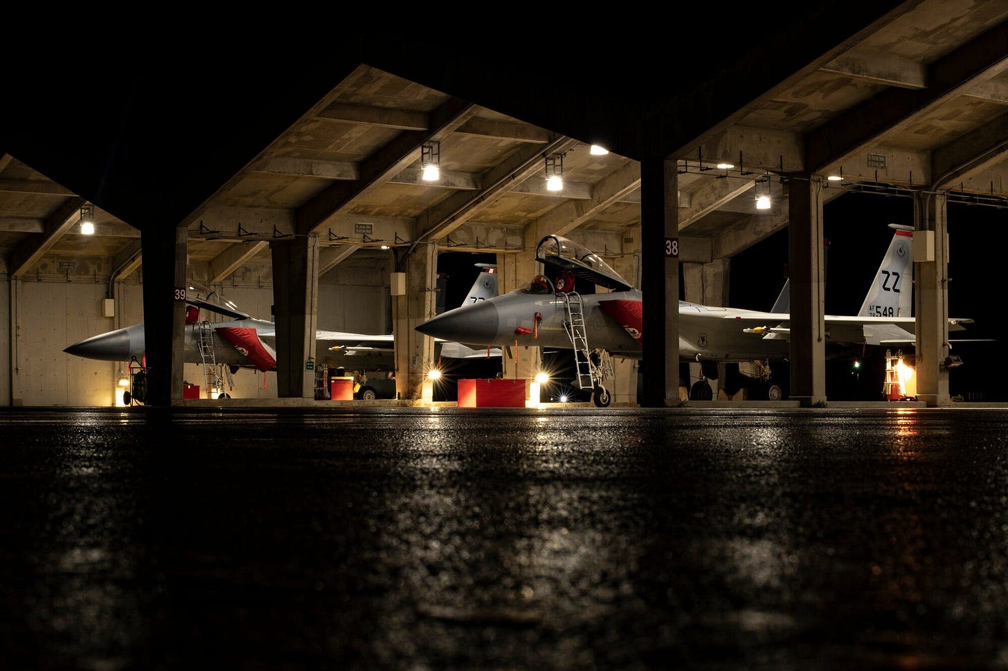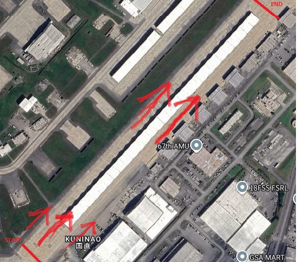 The route our daily FOD walk followed. Note the concrete awnings in the center of the flightline— these will be important in a moment.
